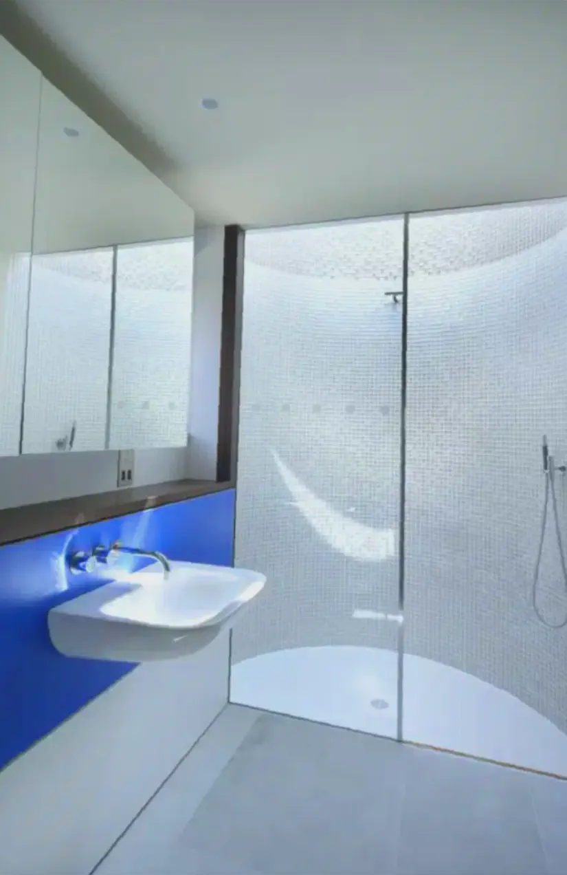Egy kreatív megközelítésben a tervezők a fal egy természetes mélyedését alakították át kifinomult zuhellyé, megszabadulva a hagyományos, helyet foglaló egységektől. Ez az ötlet nemcsak tökéletesen hasznosítja a rendelkezésre álló teret, de extra helyet hoz létre más nélkülözhetetlen elemeknek, mint például egy kéztörlő vagy egy szabadon álló kád. Az üvegpanelek alkalmazása átlátszó anyagok helyett hozzájárul a nyitott, könnyed hangulathoz, megelőzve a zsúfolt hatást.