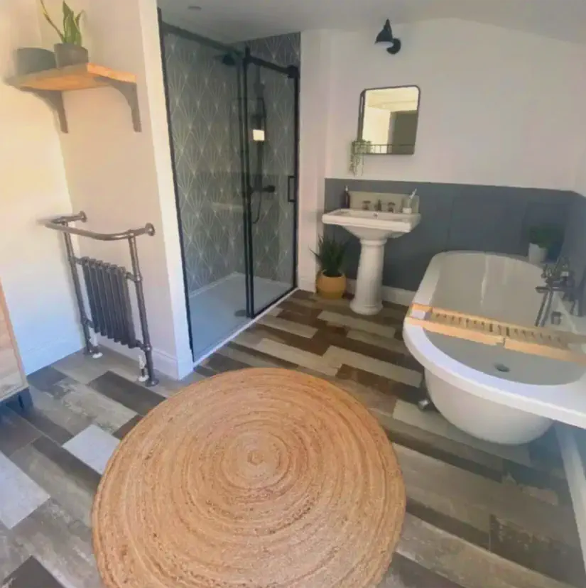 A fürdőszoba átalakítása varázslatosan sikerült, ahol a luxus találkozik az okos megoldásokkal. A szobában uralkodó eleganciát egy csodálatos kád adja, amit kifinomult falburkolat és egy letisztult zuanyag egészít ki. A zuanyag falburkolata különleges art deco mintázatú, amit egy online piactéren találtak. "Nyolc méter szürke hatszögletű csempét vettem mindössze harminckét ezer forintért," meséli a tulajdonos. "Ez egy csempeboltban jóval többe került volna!" Ezek a csempék lettek a tervezés alapköve. A merész falburkolathoz fakézetű padlócsempét választottak, miközben megtartották az elegáns fekete-fehér színvilágot.