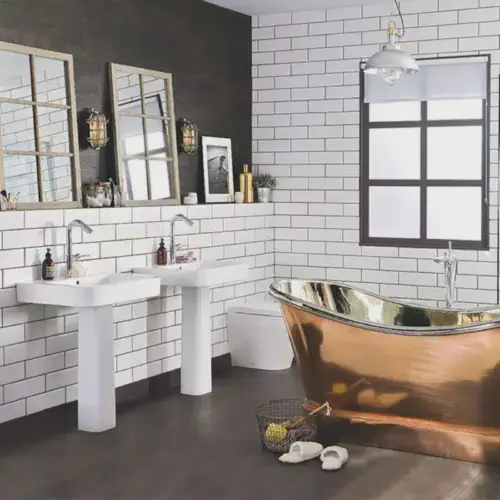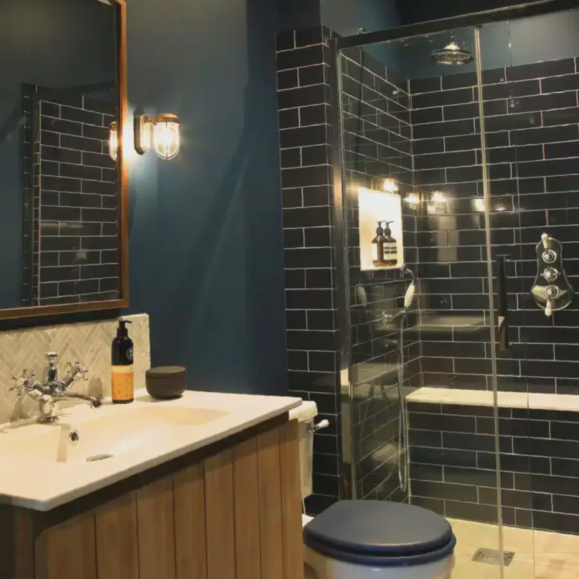 A fényes króm csaptelepek és a sötét metrócsempék párosítása váratlanul friss, urban stílust eredményez. Ez a kombináció egyszerre ad letisztultságot és meleg hangulatot, tökéletes egy modern fürdőszobához.