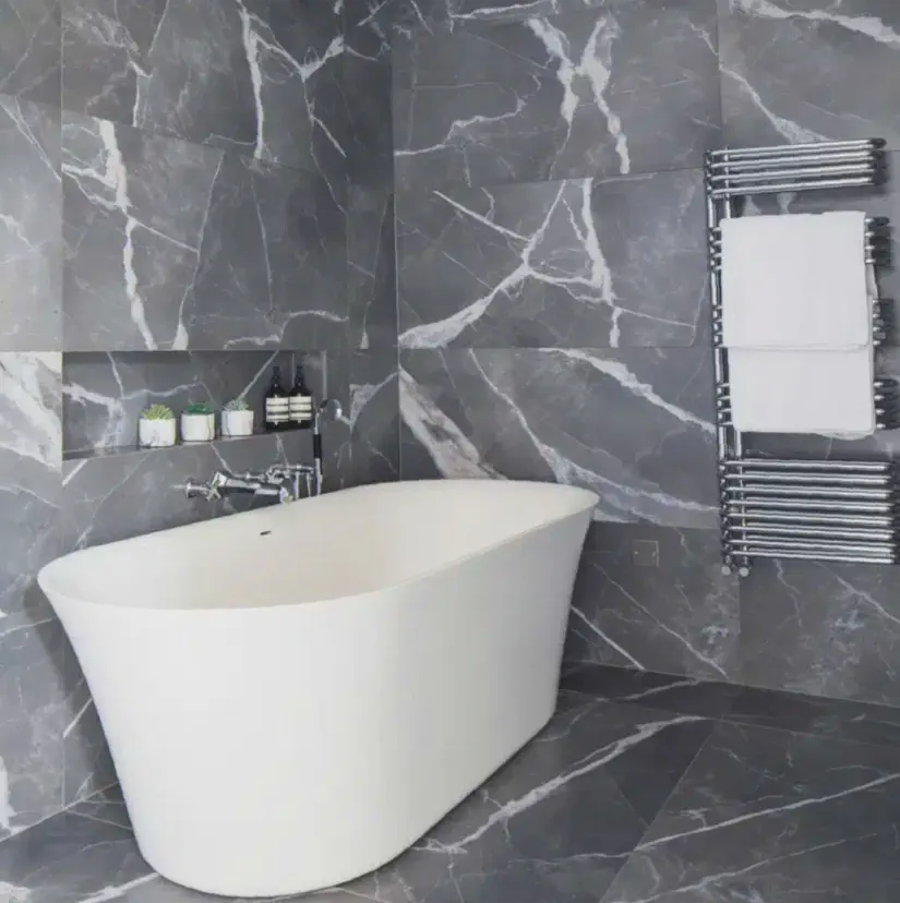 A nagyformátumú, erezett márvány csempék mozgást és mélységet visznek a térbe. A szürke árnyalatai kifinomult alternatívát jelentenek a hagyományos fehér helyett, anélkül hogy túlterhelnék a helyiséget.